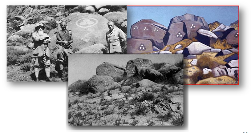 N. Roerich nell’1.935, dipinse ciò che vide nel Deserto del Gobi, in Mongolia davanti a dei piccoli menhir: una scultura di pietra, che raffigura un Guardiano, con un Calice ornato da fuoco posto nella sua mano sinistra. N. Roerich ammise che a volte un calice era un simbolo di fuoco, e non potrebbe essere collegato con il concetto di un rituale di sepoltura. Il calice è collegato al Graal e alla pietra del cielo Cintamani, pertanto, la scultura del guardiano con il calice è un’indicazione e un avvertimento: ci si trova in un luogo sacro protetto.