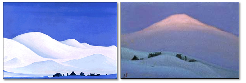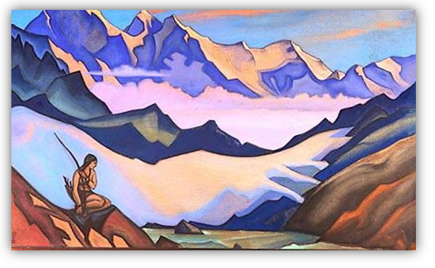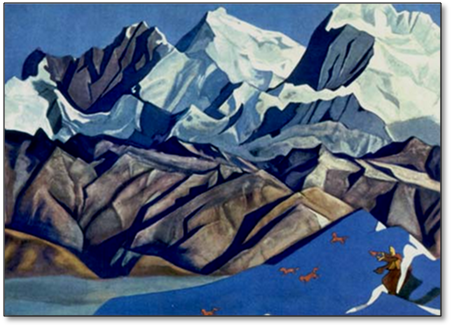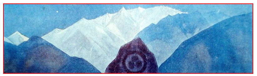 Inizialmente N. Roerich intendeva visitare Adyar dove aveva legami con il movimento teosofico, ma all’arrivo in India, cambiò idea e andò nel Sikkim a Darjeeling, perché? Se gli incontri con gli inviati Fratellanza Bianca a Londra, New York e Chicago sono stati inaspettati e breve termine, questo incontro è stato pianificato da tempo nell’incontro a Londra dell’1.920. Nicholas Roerich, nella sua infanzia aveva appeso in casa un dipinto del sacro monte Kanchenjunga del Sikkim, quest’icona ebbe la funzione di faro spirituale per il futuro cammino di Roerich. Secondo H.P. Blavatsky, il Sikkim era il luogo dove risiedevano i Mahatma.Figura 1. N. Roerich – La perla della ricerca