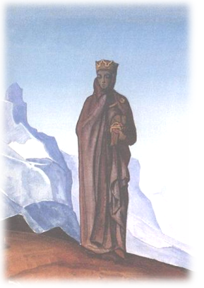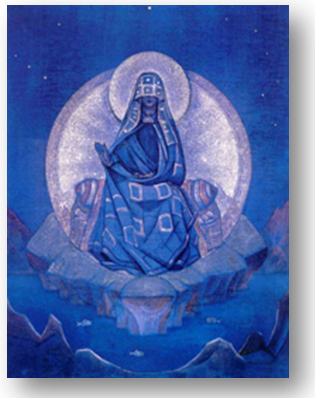 La Reggente del Mondo sta davanti alle montagne nevose e il cerchio d’oro della sua corona brilla al sole. Nelle mani ha il cofanetto ben noto. Lo portava sulla schiena un cavallo bianco favoloso sulla tela “Chintamani”, che apparteneva alla serie di quadri eseguiti in Sikkim.
