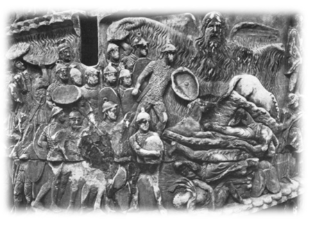 Marco Baistrocchi[7] descrive le misteriose raffigurazioni sulle colonne Traiana e Aureliana. Sulla prima è raffigurato Giove, il Signore della Folgore, che lancia il fuoco celeste sui Daci; sulla seconda è raffigurato l’imperatore filosofo (Iniziato) che in Germania, assiste seduto mentre un fulmine[8] colpisce una macchina da guerra nemica, e una pioggia torrenziale travolge l’esercito avversario.