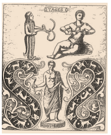 Un giorno un contadino che arava un campo nei pressi del fiume Marta, in quei di Tarquinia, vide una zolla sollevarsi dal solco e assumere le sembianze di un fanciullo, lo chiamò Tagete (Tages). Il fanciullo era dotato di grande saggezza e di virtù profetiche (per cui talvolta viene raffigurato con i capelli bianchi). Visse soltanto il tempo necessario per insegnare agli Etruschi, accorsi sul luogo dove era nato, l'arte di predire il futuro, scomparendo poche ore dopo la sua miracolosa apparizione. Le norme da lui dettate furono trascritte e raggruppate su tre serie di libri sacri: gli Haruspicini, i Fulgurales e i Rituales.