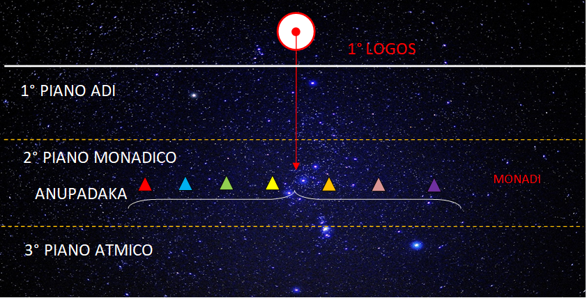 Mosse dal Volere del Primo Logos, le Monadi subiscono una modificazione chiamata “la concezione del Figlio” e passano nel Secondo Logos e dimorano in Lui. Le Monadi prendono forma sul Secondo Piano della manifestazione Monadica anche detto Anupadaka, dove esse appaiono come Figli del Padre, appunto come lo è il Secondo Logos ma Figli più giovani, senza alcuno dei loro poteri divini. La Monade proveniente dal mondo Arupa o senza forma, è detta Anupadaka, cioè priva di aspetti che la separino dal resto della creazione.