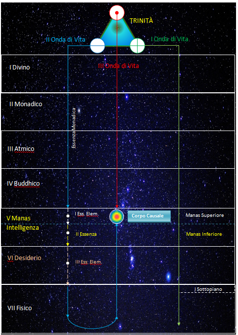 Durante un periodo chiamato una Catena, si manifesta da prima nella materia del Piano Adi; alla fine della Catena ritorna al Secondo Logos da cui emana di nuovo, al principio di una nuova Catena, per animare la materia del secondo Piano iniziando con tutte le esperienze della Prima Catena. Di Catena in Catena l’Essenza Monadica scende e a principio del Quinto Piano comincia ad animare la materia più sottile del mentale superiore. Da ora in avanti l’essenza non più atomica ma molecolare, prende il nome di Essenza Elementale, mentale superiore e inferiore, la materia contenuta in tali combinazioni è suscettibile di essere plasmata in forme-pensiero. L’onda di vita passando al sesto piano o emozionale fornisce alla materia la sensazione di desiderio.